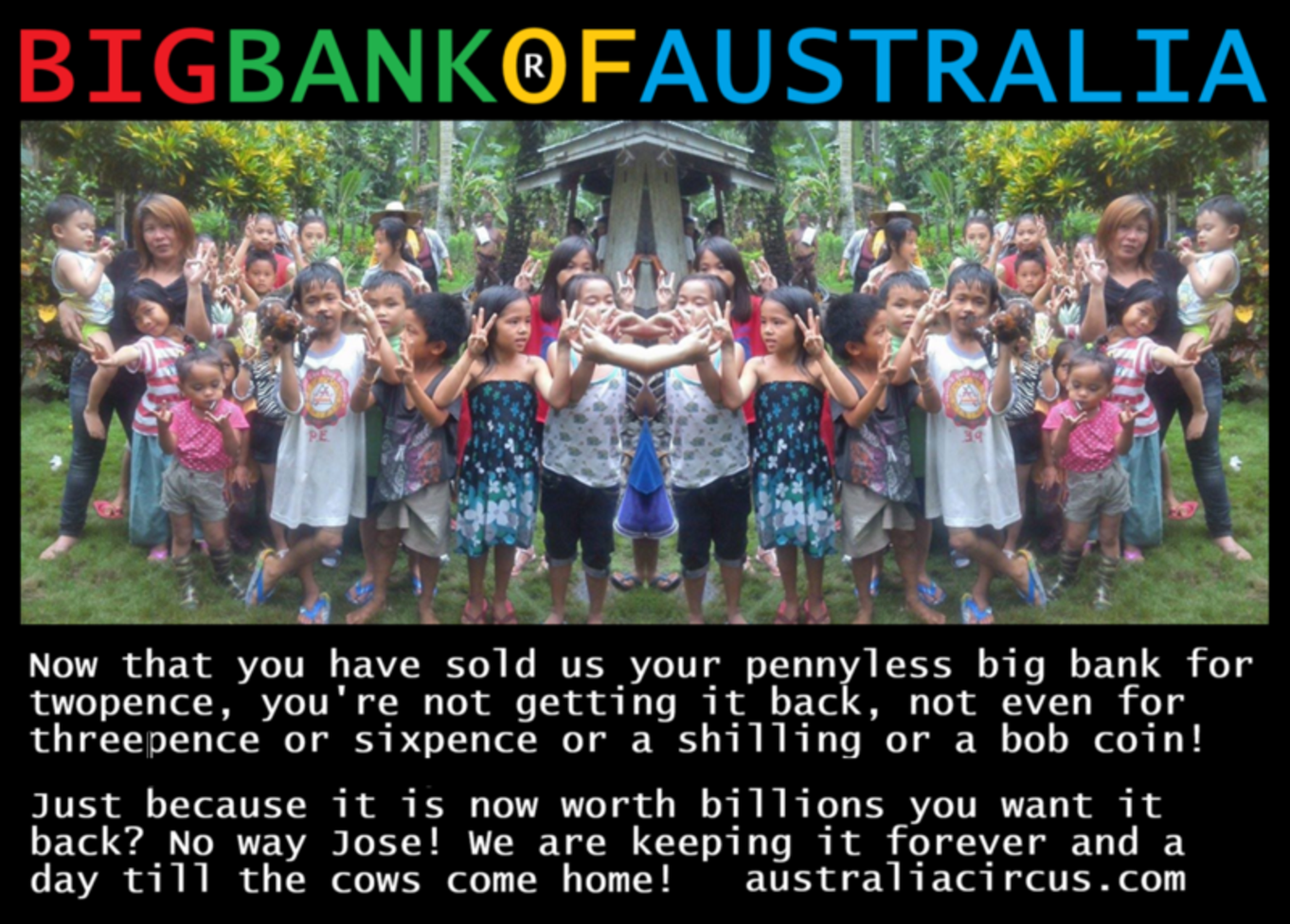 For anyone who thinks the BIG BANK OF AUSTRALIA is not fair dinkum, it is a registered trademark in Australia, as is POLICE CIRCUS, WISHING  and QUEENSLAND